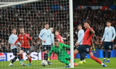 Бен Уайт (№12) отбеляза първия си гол за националния отбор на Англия, но по-късно допусна нарушение, довело до дузпа за Уругвай, и беше освиркан от част...