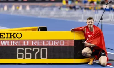 Швейцарецът Симон Ехамер заби нов световен рекорд в седмобоя по време на Световното първенство по лека атлетика в зала в Торун, Полша, изпреварвайки резултата на Аштън...